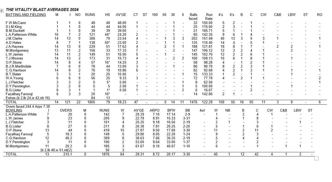 DeleteVery hard to know where to start with those figures. But two lowlights are our overseas player being probably the worst we have ever had, and how many people played pretty much every game while having an average below 17. Having watched all the home games I thought the bowling had been better but based on the average runs per over conceded, on average over 20 overs they would have been getting around 175, which is ridiculous.